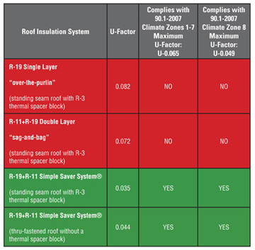 All architects, engineers, contractors, erectors, code compliance officials and owners should be aware of these revised U-Factors to ensure that the buildings they design, build, inspect and occupy actually comply with the intended minimum thermal performance requirements of current energy codes. Thermal Design will assist any of these individuals in complying with the minimum energy code requirements and design goals of their projects. Our patented Simple Saver System™ liner system can be installed in both standing seam and thru-fastened metal building roofs to safely and economically exceed the most stringent metal building roof thermal performance requirements in all current versions of the 90.1 Standard.